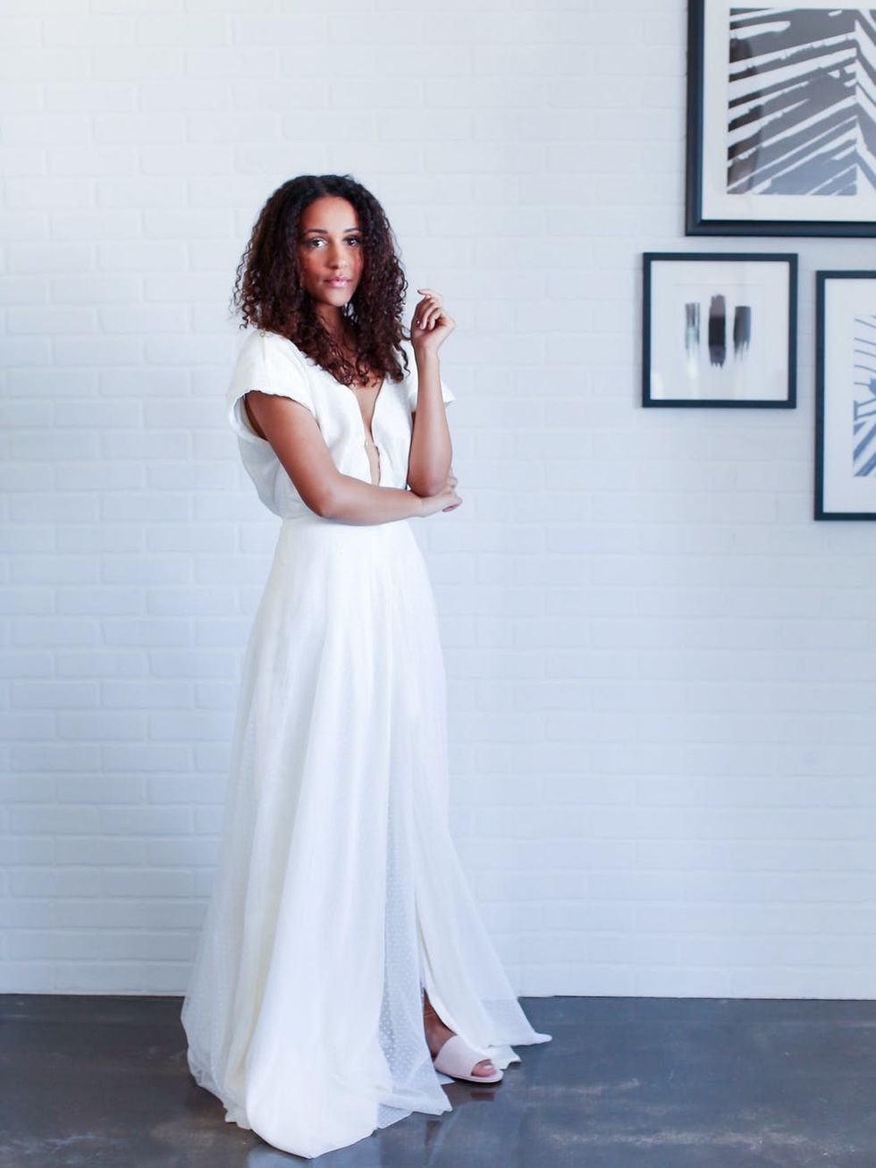 “I utilize many of the same fabrics that more traditional dresses use, but I’m using them in different ways: Cleaner silhouettes, creating interesting textile treatments on them, adding thigh-high slits, and plunging necklines,” says Halali. “I always want things to be tasteful, but I think brides are willing to be a little less modest these days, which allows for some fun elements.”