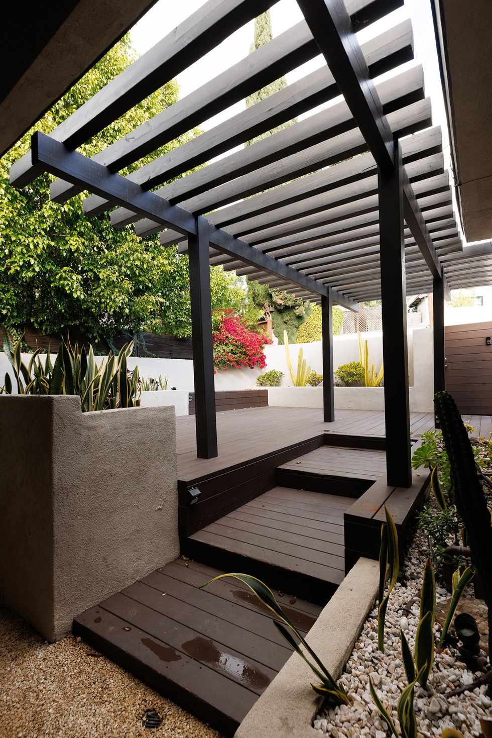 A combo of wood, concrete and stone keep the area eco-friendly with drought-tolerant plants.