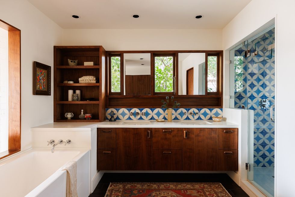 The bathroom echoes the poolside inspiration with a retro vibe.