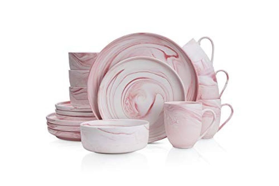 Style doesn't stop at just the furnishing, it includes the plates and silverware. This pretty Marble Porcelain Dinnerware Set brings the subtle pink color to the tablescape for a photo-ready dinner party.