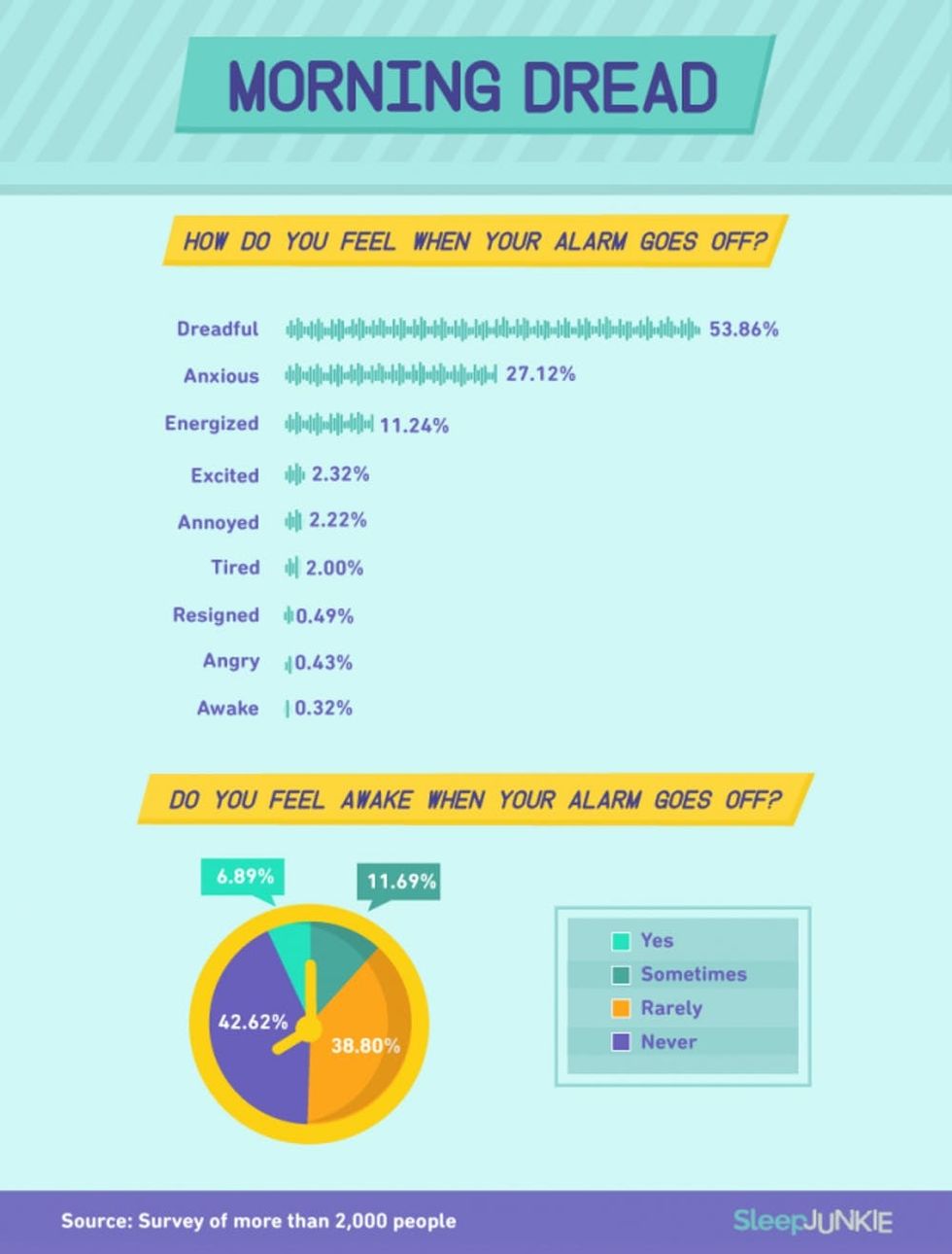 The most shocking finding? Fewer than a third of a percent of those surveyed describe their feeling on waking to an alarm as “awake,” and less than 14 percent overall reported a positive feeling like being energized or excited. This is especially meaningful when you consider that more than 80 percent of respondents claim to feel dread or anxiety when their alarm goes off. Drilling down into that idea of feeling awake, again over 80 percent of people who took the survey say that they rarely or never feel awake after an alarm. Not exactly the hallmark of a good night’s rest.