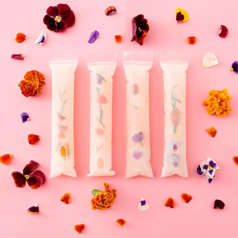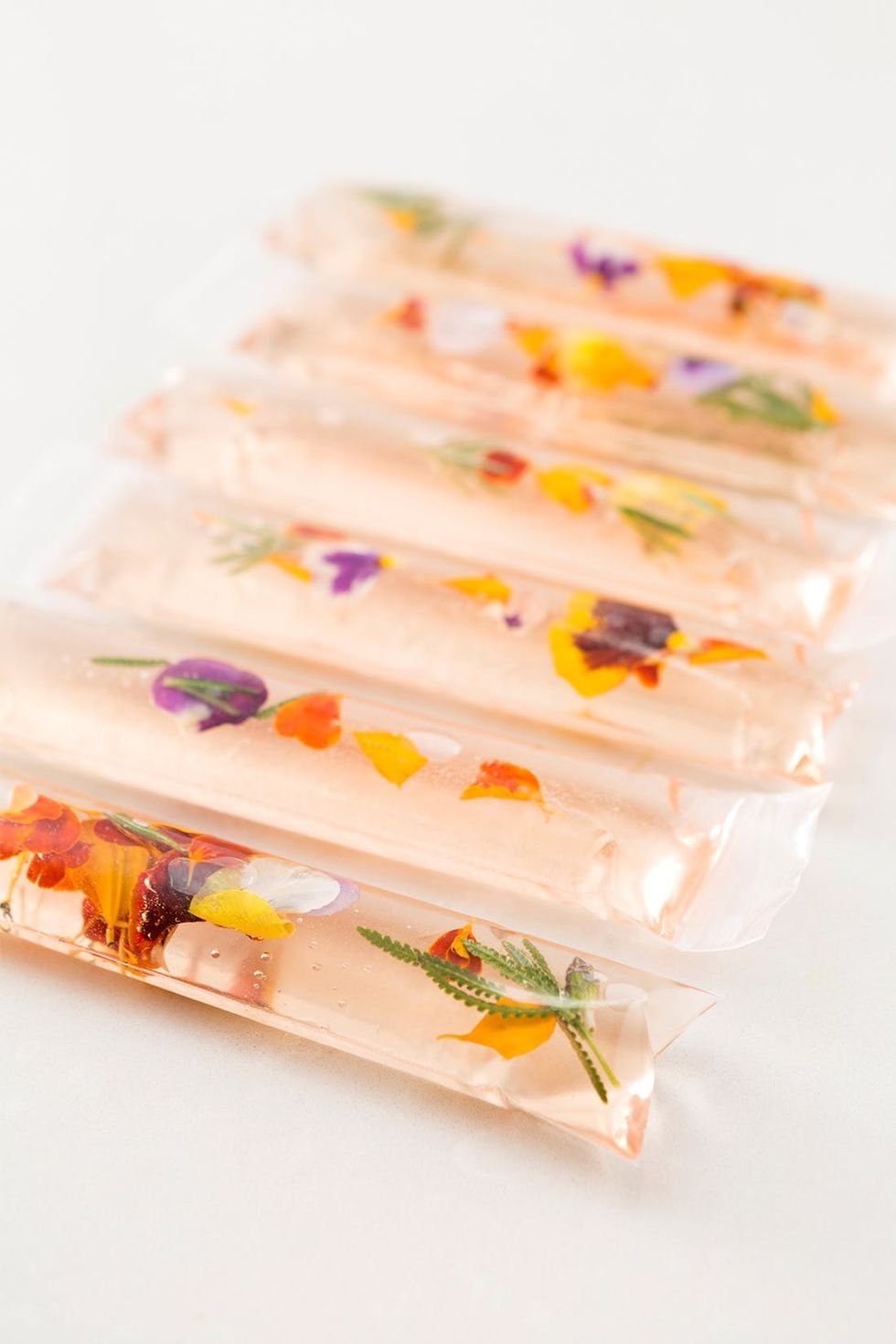 Using a funnel, add rosé to the popsicle bags, leaving some room for the flowers and syrup. One bottle made five pops.