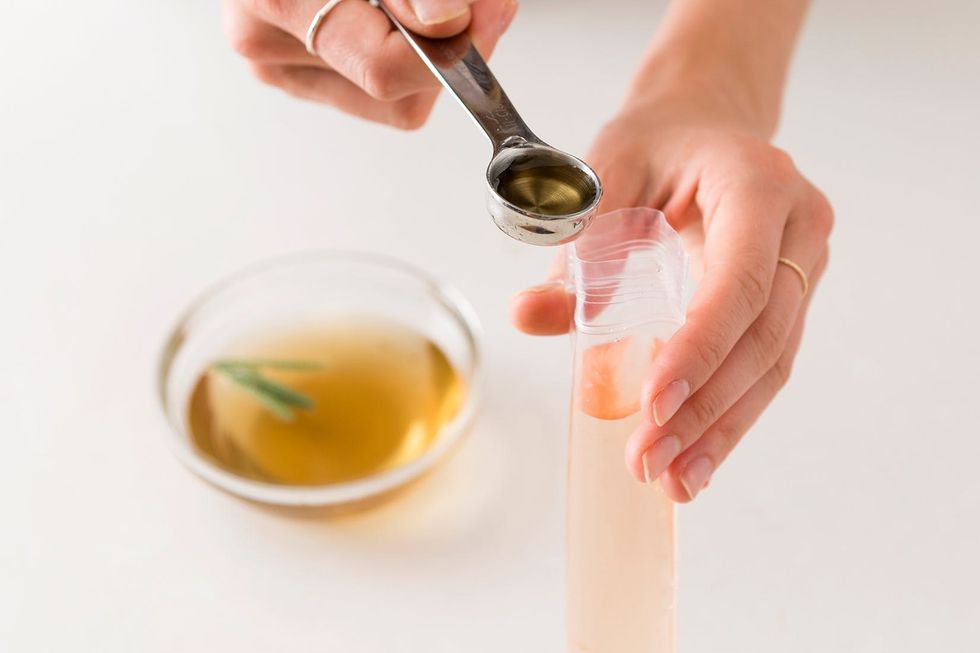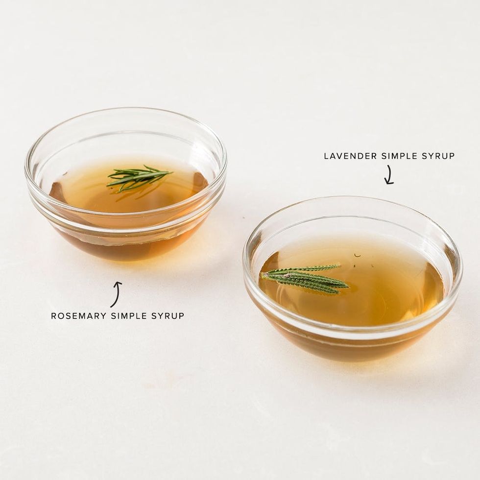 Begin by making two different types of simple syrup with fresh herbs. We went with rosemary and lavender; it went great with the rosé! Simple syrup is a great way to add fun flavors to your cocktails and drinks. To make the syrup, bring 1/2 cup of water and 1/2 cup of sugar to boil over the stovetop. Add the herbs in and let simmer for 10 minutes. Strain the herbs and let cool in the fridge.