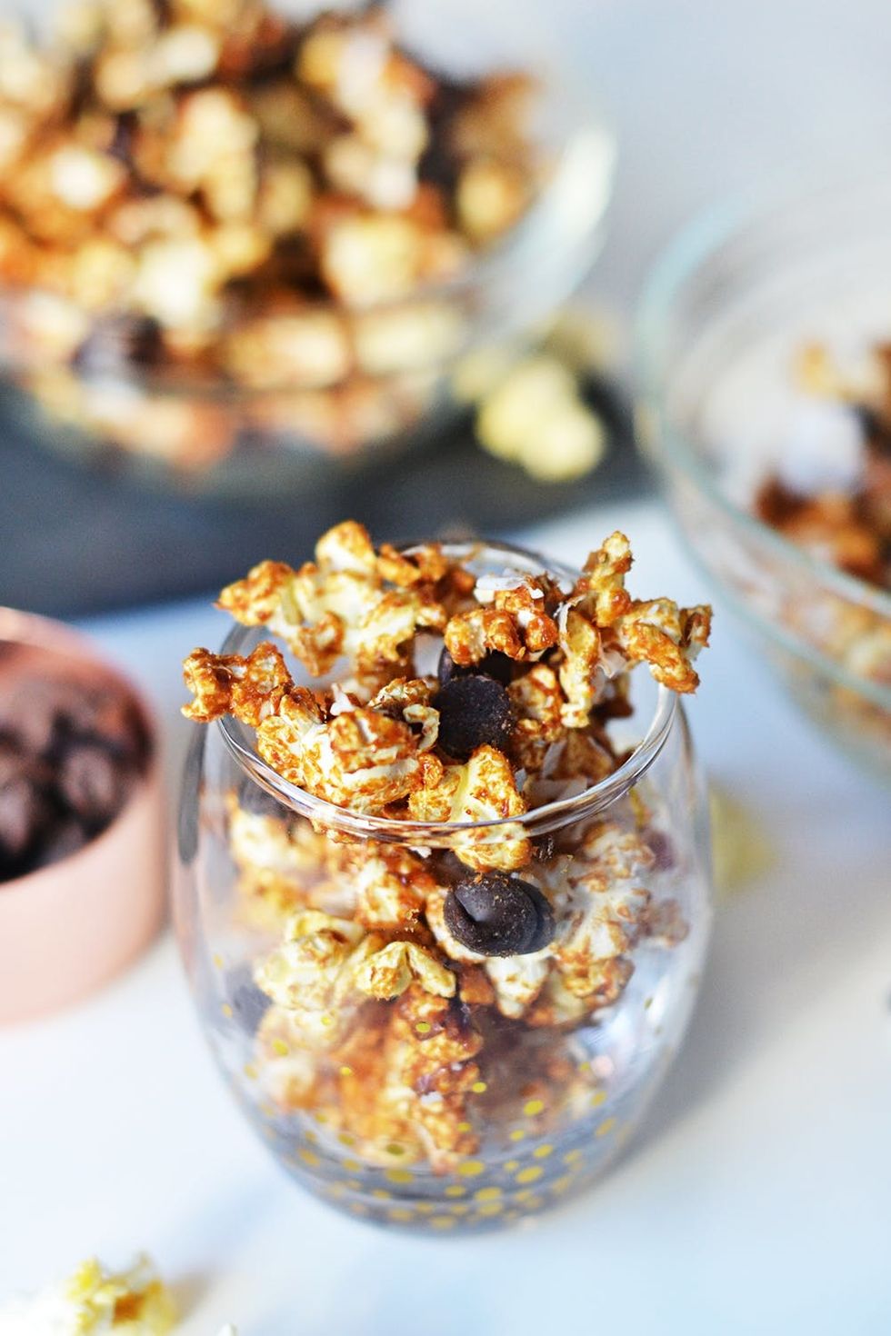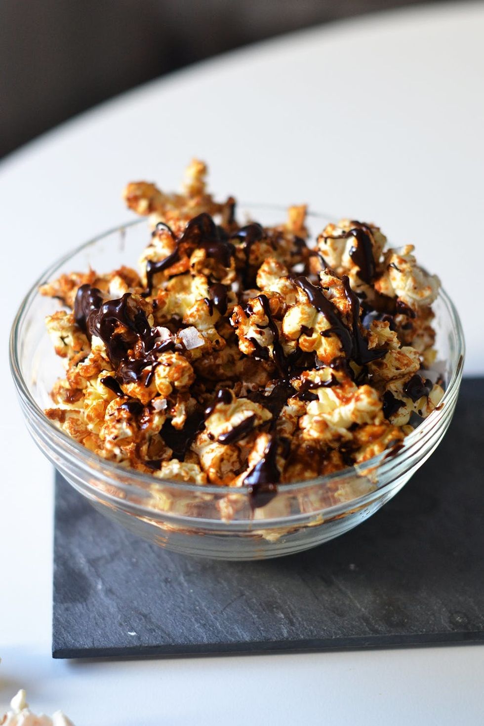 Pro tip: If you want a less crunchy treat, melt the chocolate in the microwave and drizzle on top of the popcorn. Add milk to the chocolate if it becomes too thick.