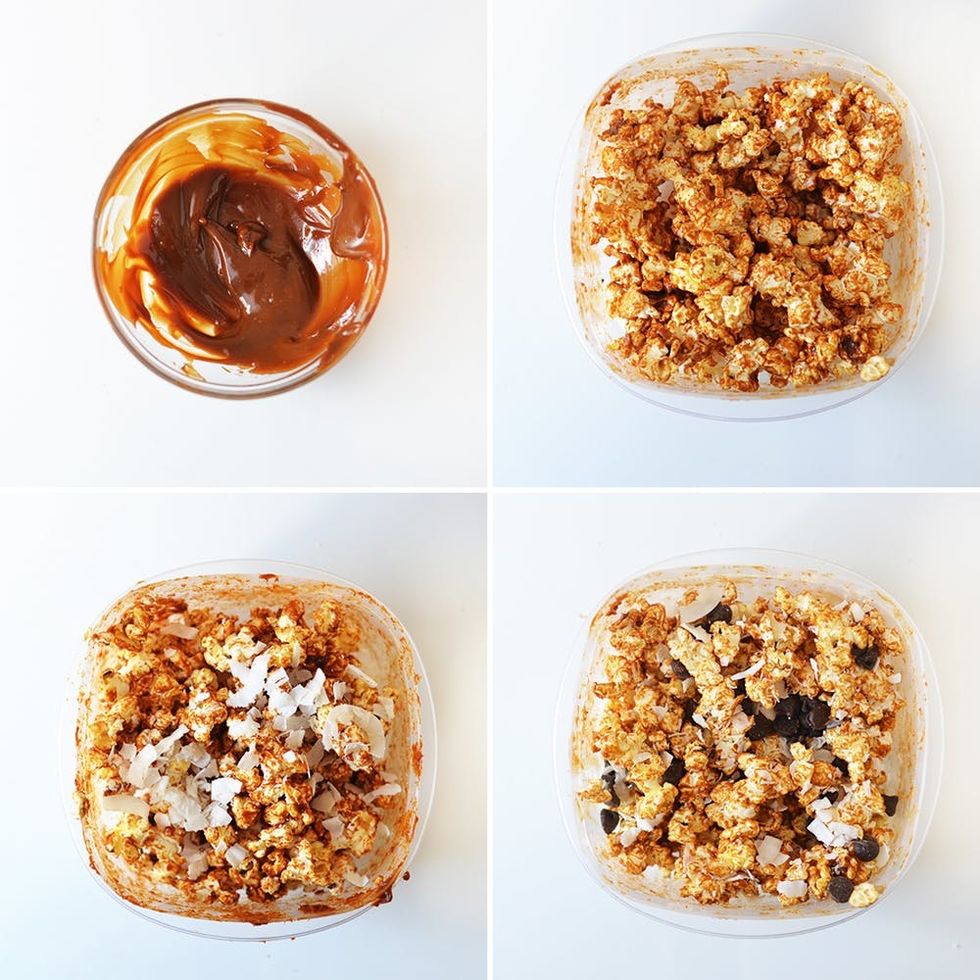 Scoop dulce de leche in a small bowl and microwave for a few seconds until it’s slightly melted. Take it out of the microwave and stir the dulce de leche until it becomes smooth. Be careful not to overcook. Carefully pour the dulce de leche over the popcorn and stir the two ingredients together until the popcorn is completely coated. Next, sprinkle coconut shavings and chocolate chips over top.