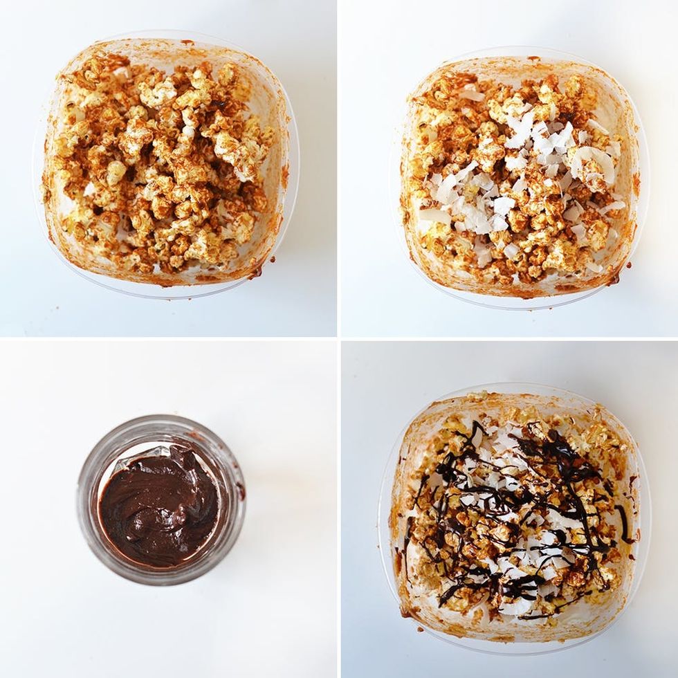 5. Next, sprinkle coconut shavings and chocolate chips over top. Pro tip: If you want a less crunchy treat, melt the chocolate in the microwave and drizzle on top of the popcorn. Add milk to the chocolate if it becomes too thick.