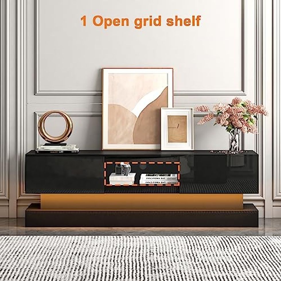 Take your television-watching habits up a notch with this black TV stand. Made with built-in LED lights, this is definitely going to set the mood for your next movie night. This media console is perfect for large televisions and has LED lights that change 16 different colors.