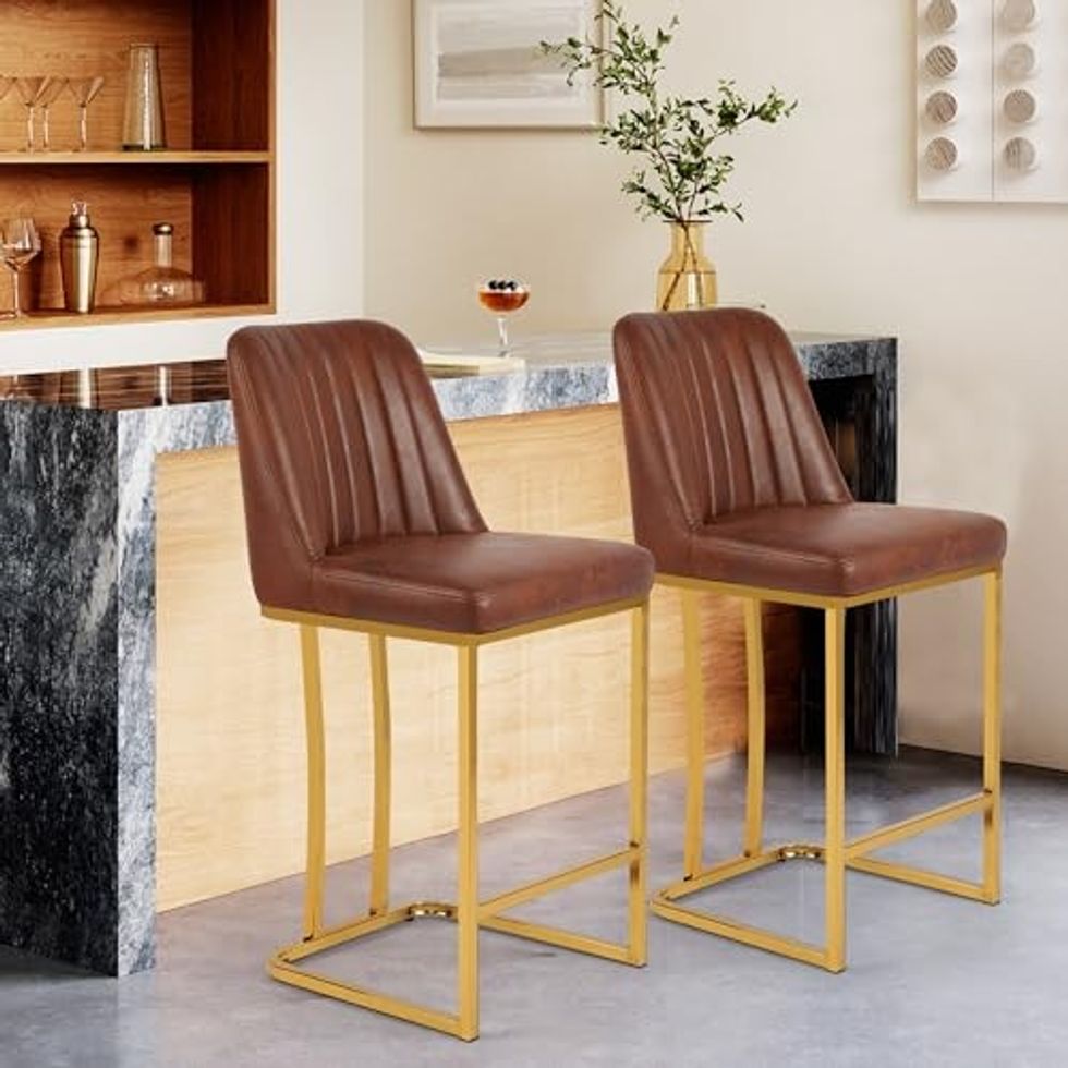 A little bit glam, a little bit vintage. This bar stool set is going to be a great addition to your kitchen island. With a gold metal base and faux brown leather that is super comfortable, this eye-catching set of two is going to really pull your space together.