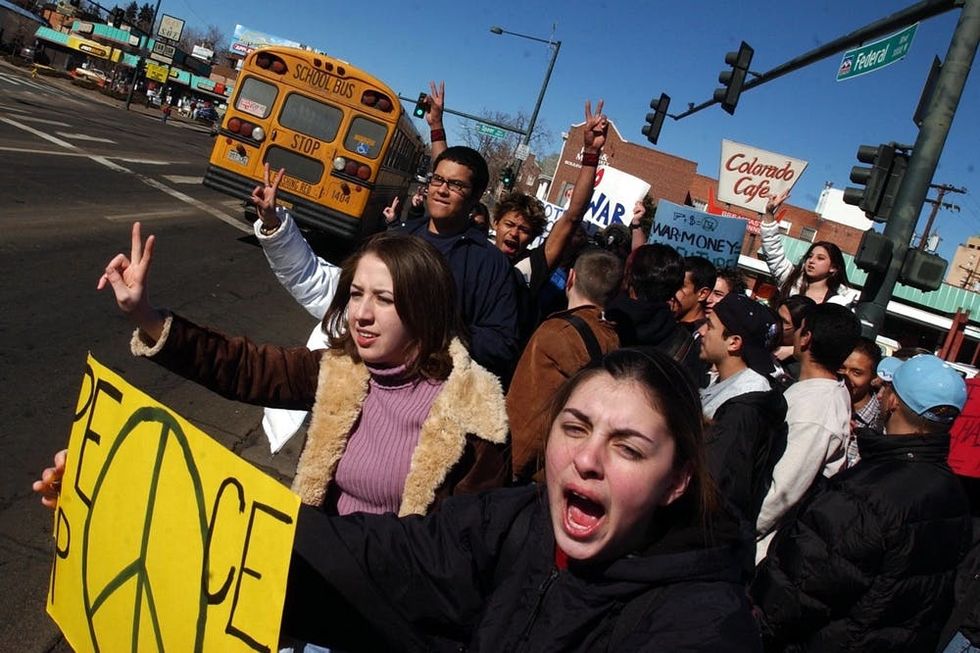 Youth opposition to the Iraq war also took off around the globe. In February and March of 2003, students in the United Kingdom, Germany, China, Somalia, and elsewhere turned out in massive numbers to speak out against the US invasion of Iraq. (Photo via Denver Post/Getty)