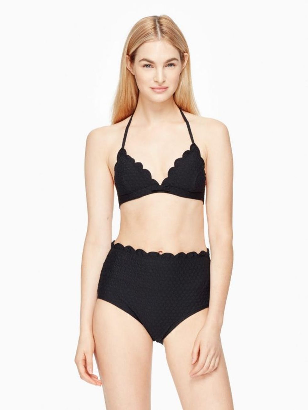 5. Ladylike Scallops: You had us at ultra-femme scallops that charm at first sight. Part Audrey Hepburn, part Coco Chanel, this timeless triangle bikini is destined for a yachting party, a Montauk getaway, or an upcoming honeymoon on the Bimini coast. Brit + Co Pick:Kate Spade Marina Piccola Scalloped Triangle Bikini ($98) + Marina Piccola Scalloped High Waist ($85)