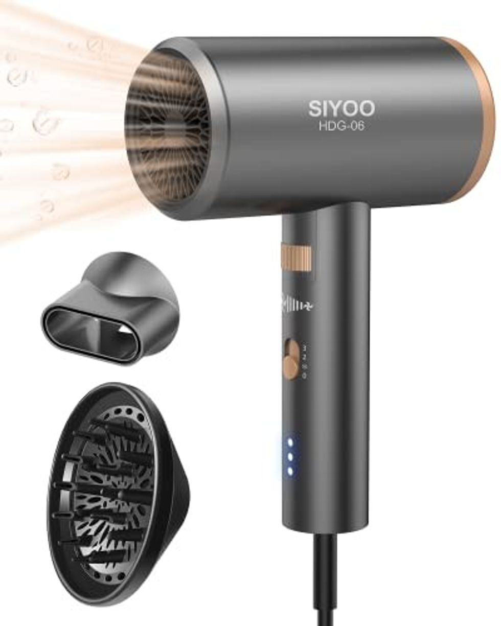 Not only is this hair dryer small enough to take with you when traveling, but it's also made with ionic technology that helps smooth frizz as well as infuse shine into hair. The temperature is adjustable up to three levels — and each order even includes two attachments: one diffuser, and one concentrator tip.