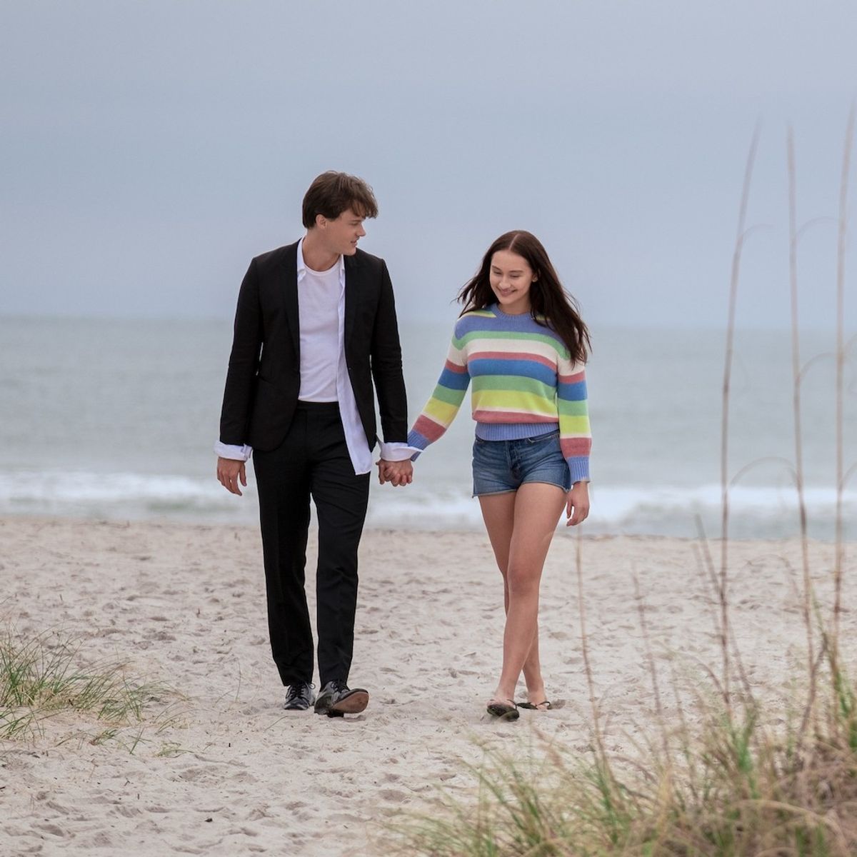 Lola Tung (Belly) and Christopher Briney (Conrad) take a walk on the beach in Wilmington, North Carolina