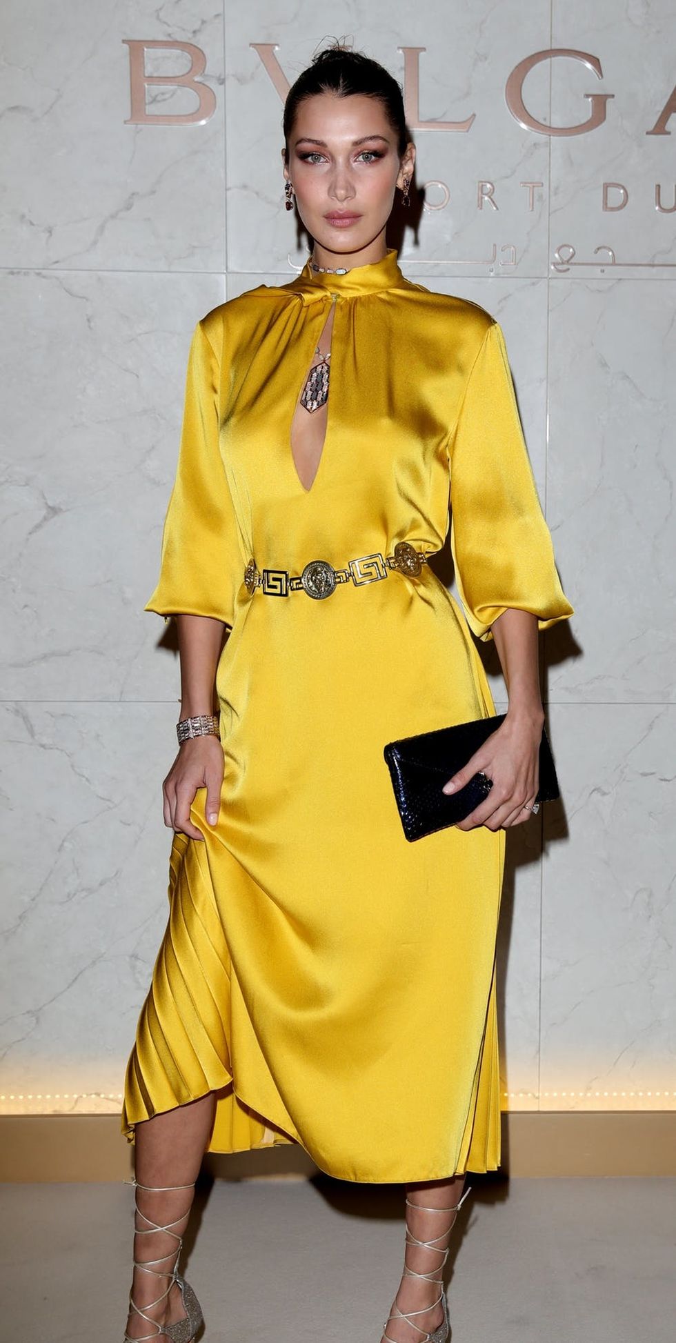 2. Bella Hadid: Just last month, the supermodel wowed in a long-sleeved yellow Fendi gown to celebrate the grand opening of the Bulgari Dubai Resort. (Photo via Vittoria Zunino Cellato/Getty)