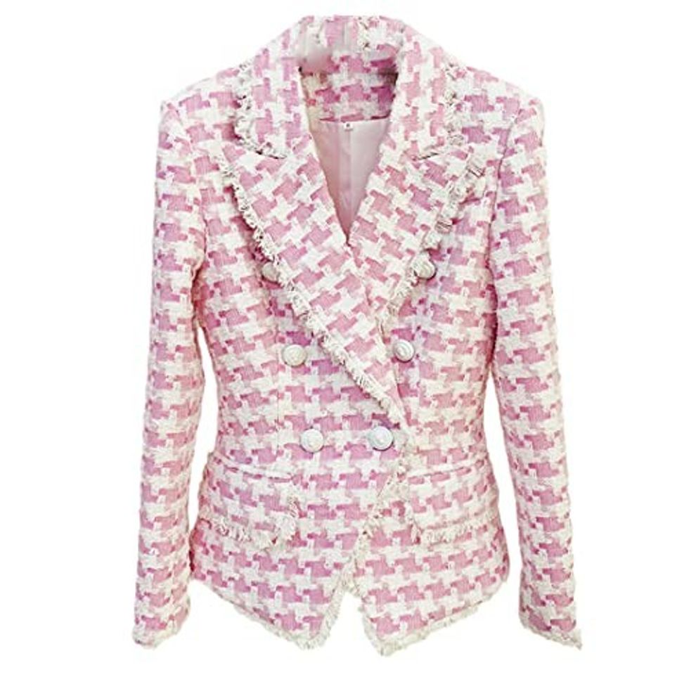 See it on AmazonFeel like Barbie in this Thick Plaid Woven Fabric High Street Quality Bodycon Chin Tweed Jacket Blazer