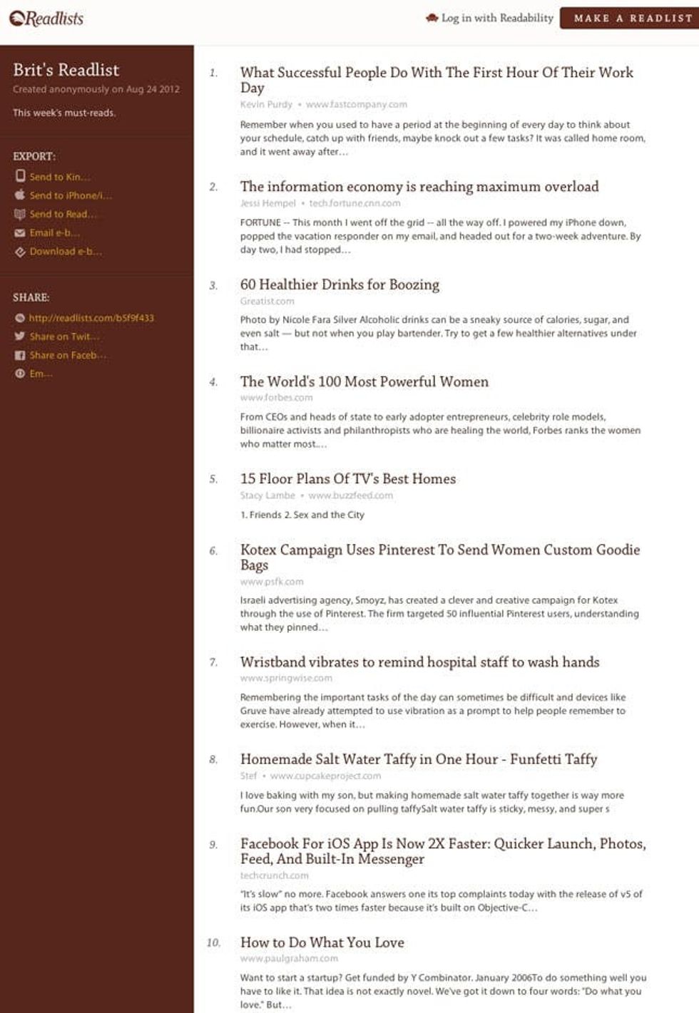 Though there are many “read it later” apps like Instapaper and many feed reader apps like Google Reader and Pulse, Readlists is different in that each user is curating a list to share with others rather than to consume themselves. Best of all, Readlists lets you download any Readlist you like into a bundled up e-book for your Kindle, iPhone, or iPad so you can easily read articles when you’re on the go.