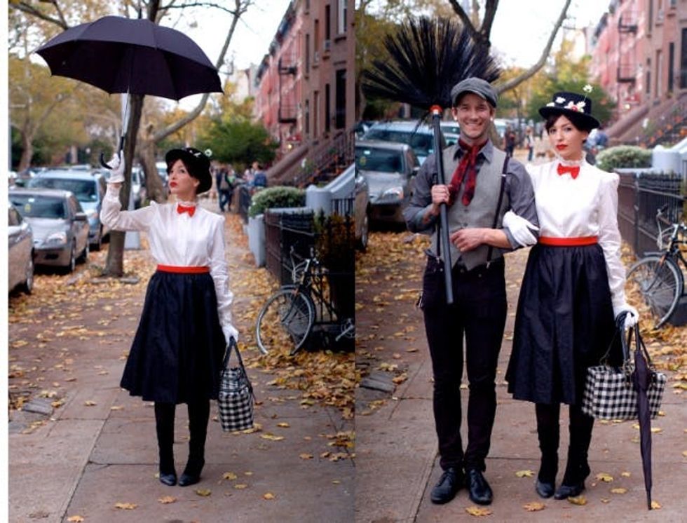 The best part about this outfit is that you might be able to create it from clothes you already have lying around your closet. The Mary Poppins ensemble is nothing but a white button-down blouse paired with black stockings, shoes and a skirt, and accented with a red belt, bow tie and white gloves. Don’t forget the black umbrella and top hat!