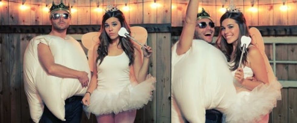 How adorable is this!? The tooth and tooth fairy as designed by Julie Ann Art is the ultimate couple costume. The tooth could be sewn out of basic white fabric and stuffed with polyfill (or could probably even be hacked out of a couple old pillows) and the toothfairy outfit is nothing but a white tutu, tights and a tank. Accent it with wings, a crown and a magic wand and you’re set!