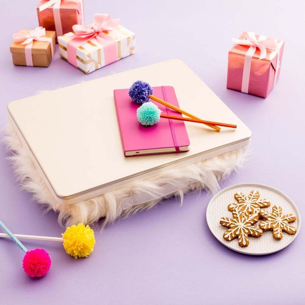 8. Faux-Fur Superstudy Lapdesk ($59) + DIY Pom Pom Pencils: In our opinion, the best work happens wherever you are most creative and comfortable, so the lapdesk is the ultimate solution to turn a couch, bed or floor into a cool work space. This one is particularly awesome because it's basically half pillow, half desk. DIY some colorful pom poms to glue on top of pencils for the ultimate study-friendly gift.