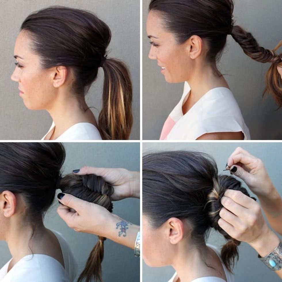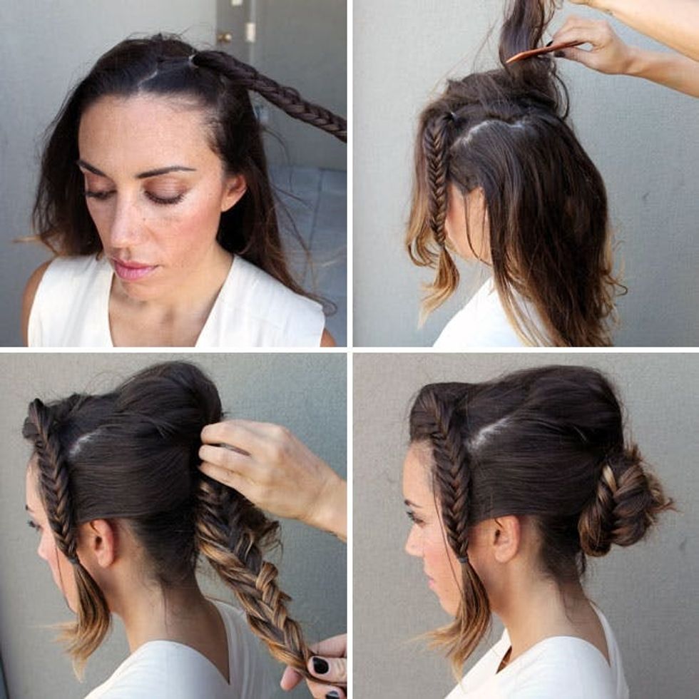Instead of a simple bun, why not add a few fishtail details to the whole affair? This gorgeous look on Jessica Alba inspired this third braid tutorial, and is a fun one to freestyle with. Section hair into two ponytails, one with the top of your hair and one with the bottom. Pull a piece out of the top pony for and braid it fishtail-style. Put the lower pony into a bun. With the rest of the upper pony, you’ll want to back comb it to give more volume, then make a pomp and secure with a bobby pin. Fishtail the rest of the pony and wrap it around the bun. Do the same thing with the first fishtail braid, and secure everything with bobby pins.