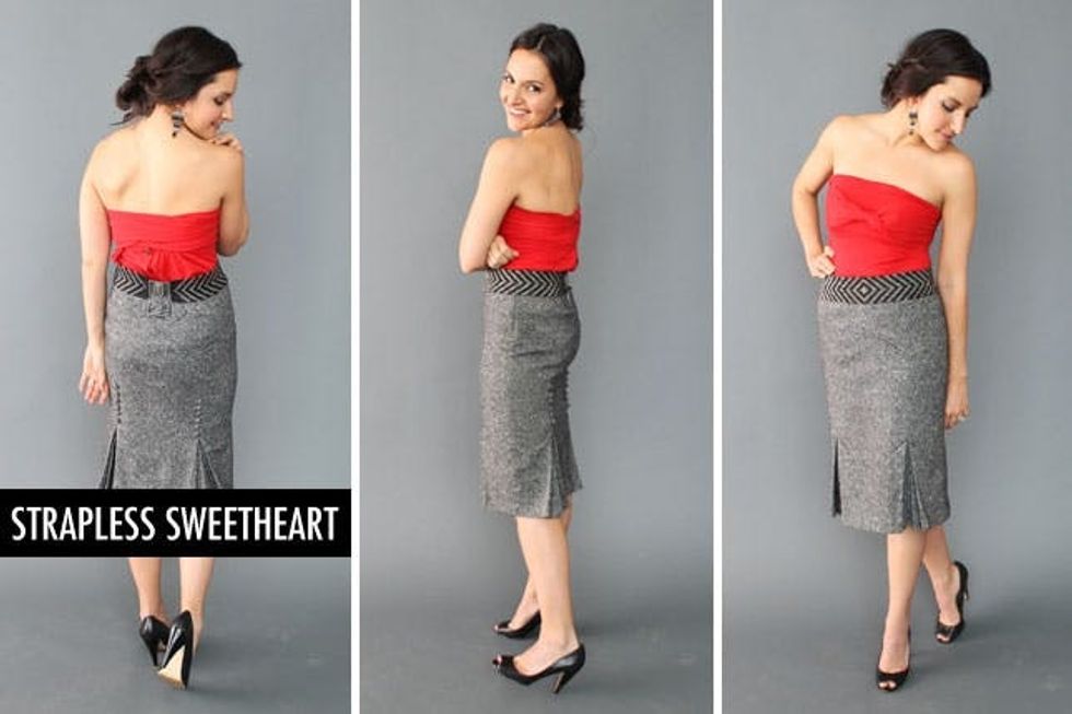 4. Strapless Sweetheart: That’s right. We turned our cardigan into a tube top with a look that reminds us of a sweetheart neckline. Put the cardigan on backwards and pull it down so that neck is around the top of your chest. Tie the sleeves around the front and you’re done.
