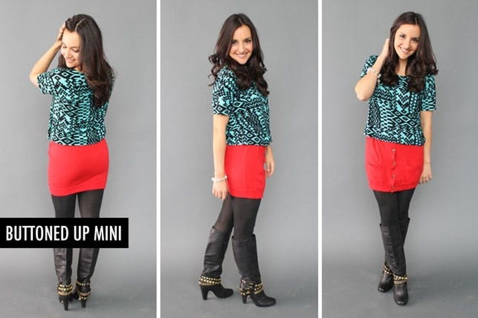 5. Buttoned Up Mini: And now a skirt! This works really nicely with our cardigan because it has a v-neck that fits right around the waist. Tie the sleeves around your waist and tuck excess sleeve into your newly made waistband and you’re set.