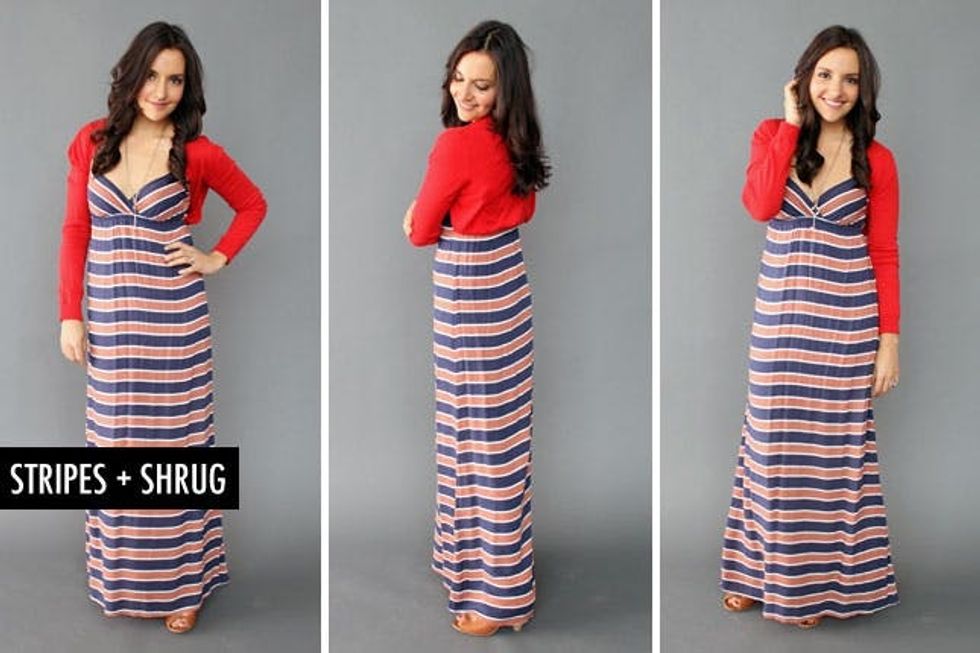 8. Stripes + Shrug: If you’re wearing a long summer dress, warm it up by turning a cardigan into a shrug. Simply unbutton the cardigan, pull the sides around to the back and pin up.