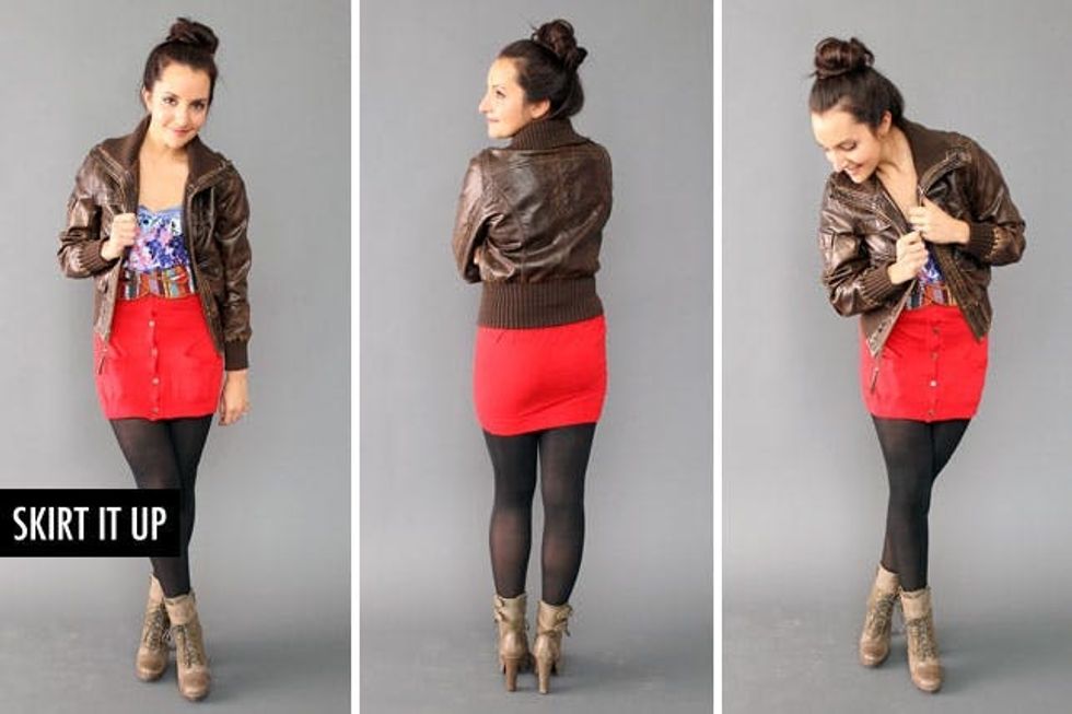 9. Skirt It Up: Another skirt! For this one we went more high-waisted and tucked everything in with a belt. Digging this bomber jacket.