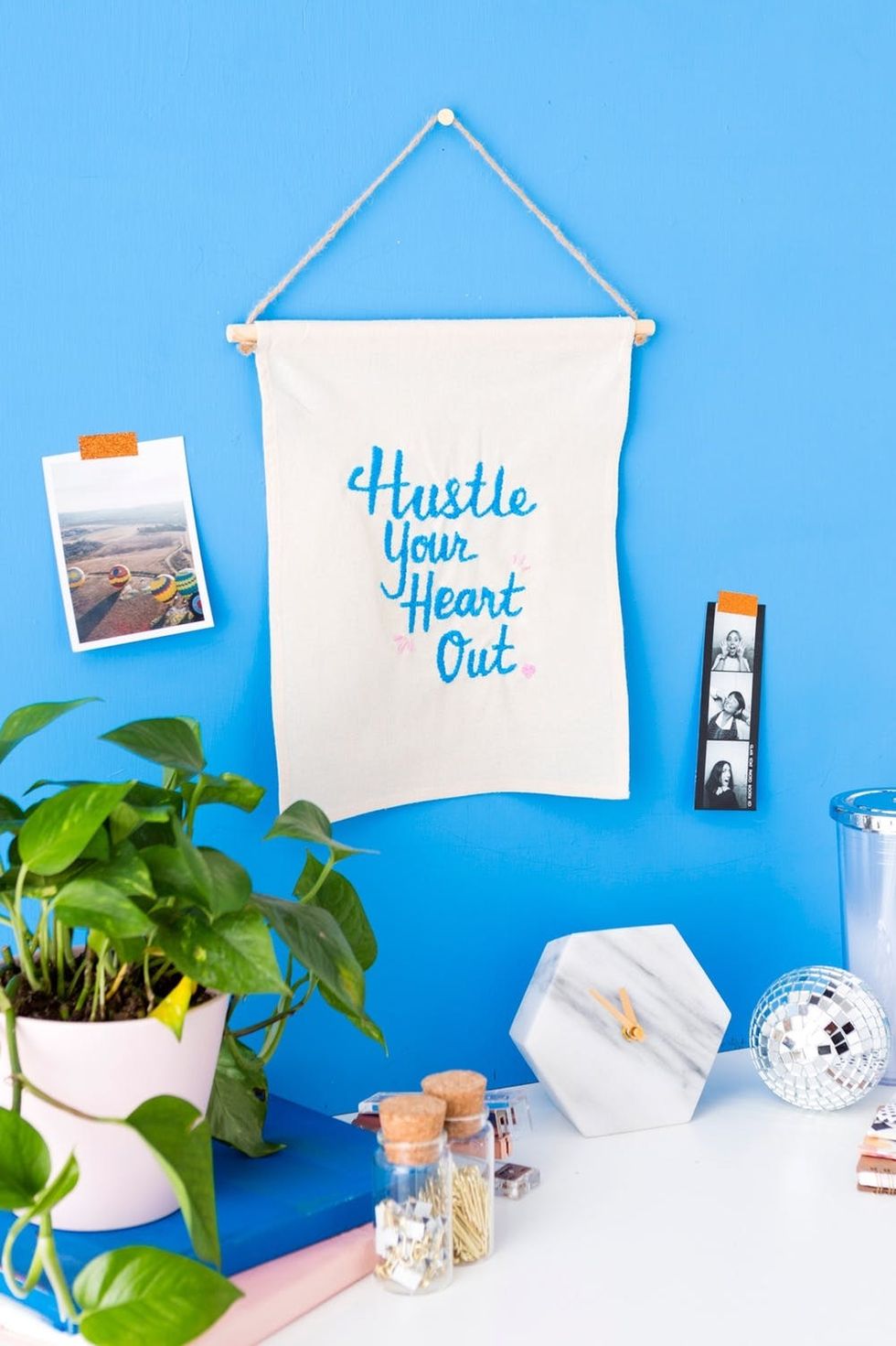 8. Make an inspiring workspace. Be the ultimate boss lady with some serious motivation. Deck out your desk with an inspirational quote using the Embroider A Wall Hanging Kit ($16). Better yet, use our free printable to show you how it’s done.