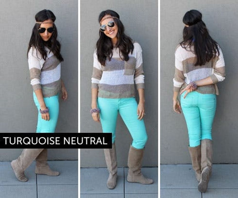 As you can tell, we're big on the "add a pop" mentality of putting together an outfit. This is a great outfit if you need to be ready for anything. Heading to a festival? Turquoise pants make you easy to spot. Got dinner plans after the beach? This neutral sweater is the perfect layer for an evening out.