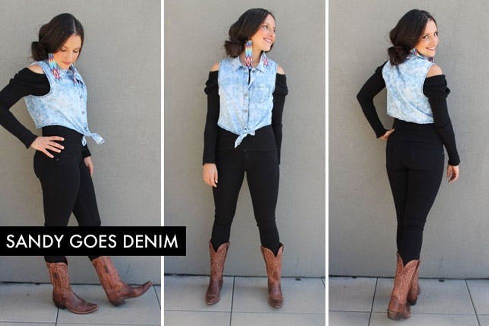 Yes, we’re talking about Sandy from Grease. When her black-clad self goes country, she throws on a denim vest, cowboy boots, and statement earrings. (Boots: Peanut Brittle Madras)