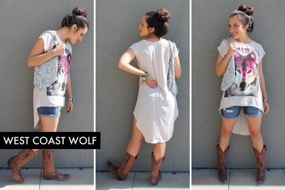 Tap into meme fashion with a neon wolf number. A shirt in the front and dress in the back, we love the changing hemline of this frock. (Boots: Peanut Brittle Madras)
