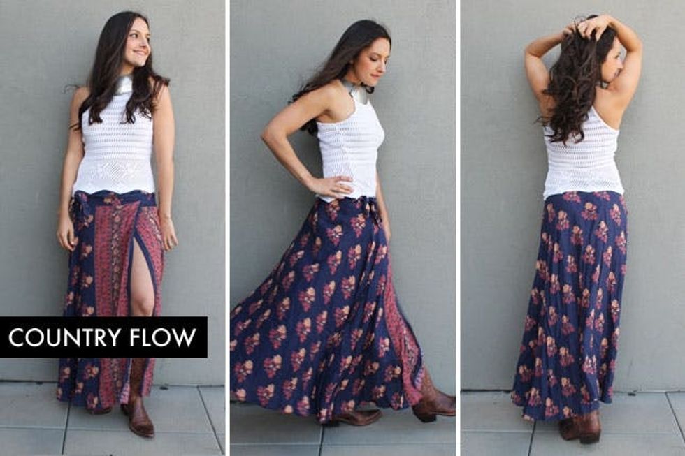 When the classic country girl goes a little bit hippie, this is what you get. Gorgeous eastern-inspired textiles with a crocheted halter. And how bangin’ is that silver statement necklace? (Boots: Peanut Brittle Madras)