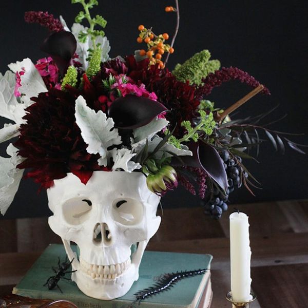 2. Floral Centerpiece: Flower arrangements are a no-brainer when it comes to sprucing up surfaces. Go dark with your blooms and use a skull vase to add some Adams Family vibes to your Halloween dinner party. (via Honestly YUM)