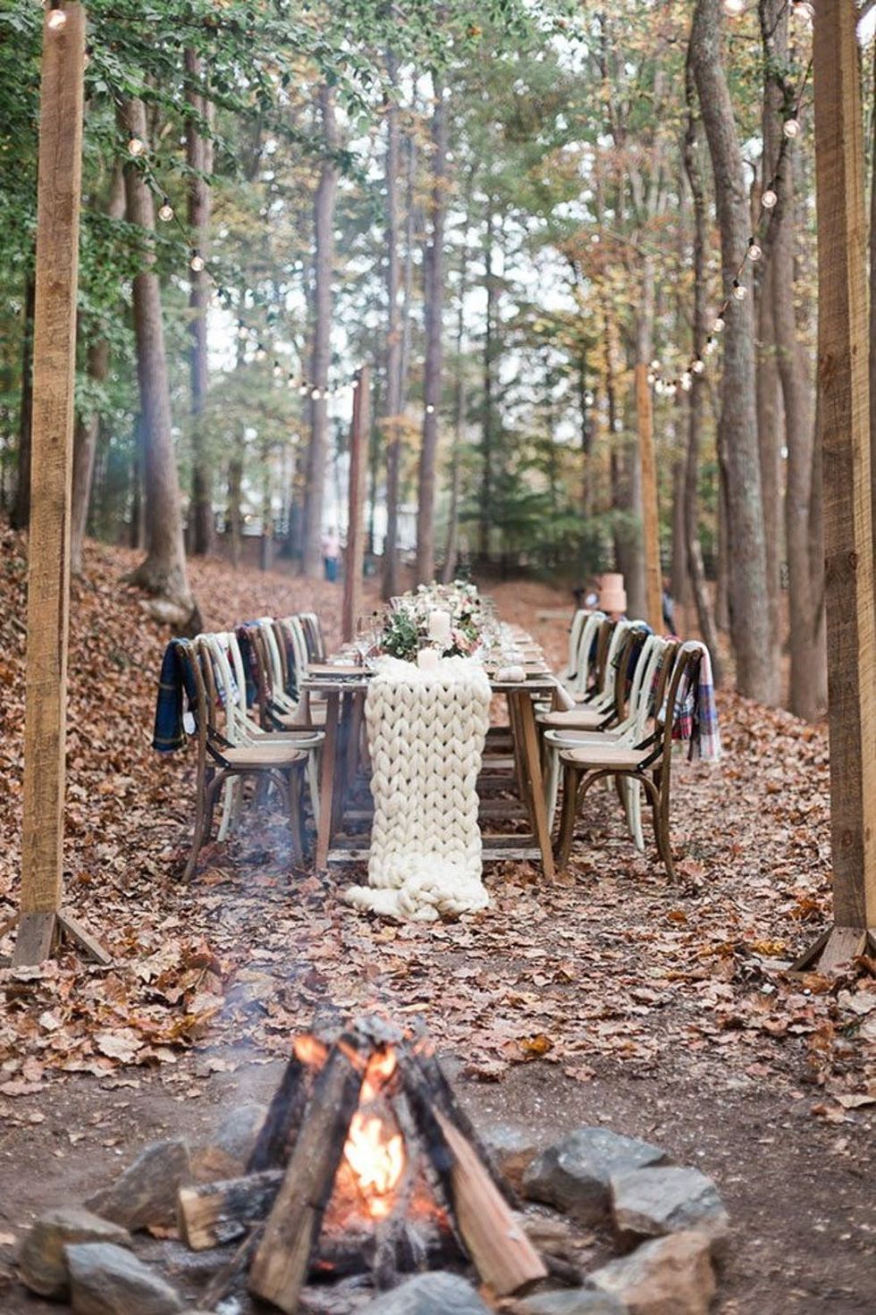 11. Cozy Woodland: This is one of those themes that’s really tailored to certain couples. If you and your bae are the outdoorsy type, don’t be afraid to let that flag fly on your big day with a super intimate arrangement — and a campfire, obvs. (via Carography Studios / Ruffled)