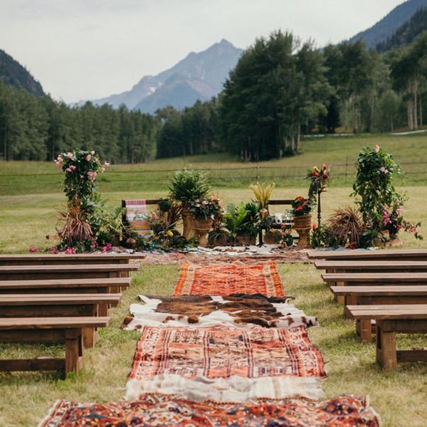 13. Mountain Boho: Here, the traditional boho setup gets a major style boost from the new layered rug trend. Thrift a few to line your aisle, get yourself some animal skulls and greenery, and you’ll be good to go. (via Cassie Rosch / Green Wedding Shoes)