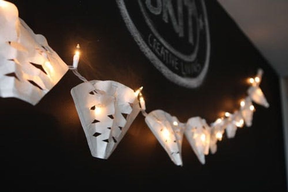 9. Boho String Lights: Spruce up those Christmas lights with a springtime touch. Grab a bunch of coffee filters, fold and cut up snowflake style. Staple over your string lights and hang!