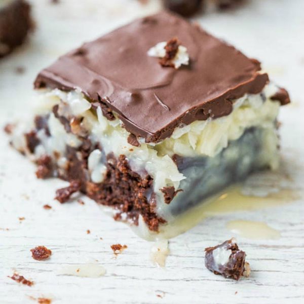 Speaking of decadent, over at Averie Cooks, Averie is whipping up some chocolate-coconut “Mounds Bar” brownies. OMG. Like the namesake candy bar, these brownies are a mashup of deep, dark chocolate and creamy coconut filling. The base is a dark 72% chocolate-fudge brownie, topped with a coconut layer made from sweetened condensed milk and shredded coconut. As if that’s not enough, the bars are then topped with melted chocolate chips. Devine!