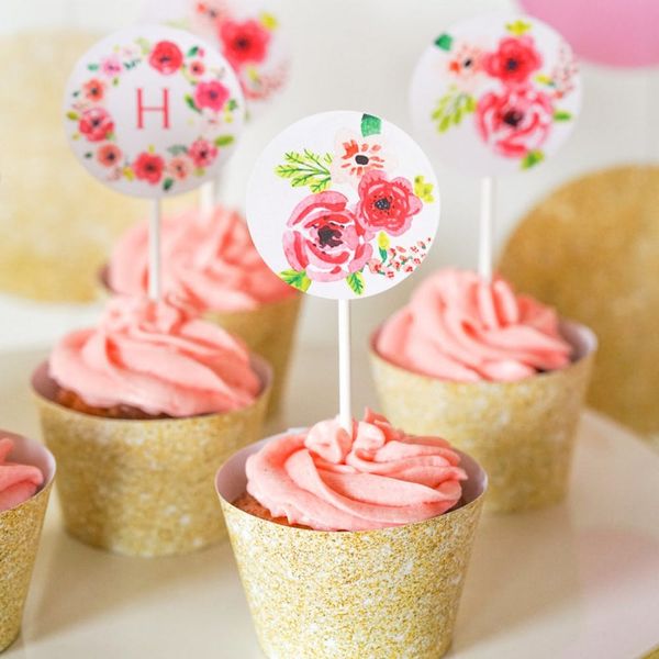 2. SunshineParties Gold Glitter Floral Watercolor Cupcake Toppers and Wrappers ($7): Make your cupcakes stand out as part of your party decor with beautiful floral cupcake toppers that you can download instantly, and pair with glitzy gold wrappers. Your guests will be in for some seriously pretty treats thanks to this upgrade.