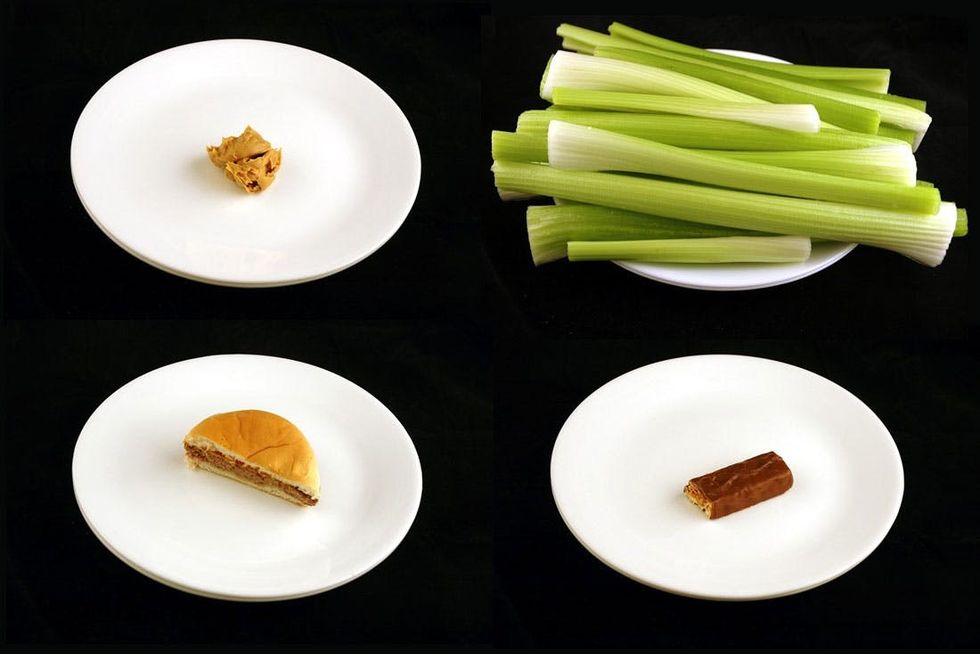 There are plenty of nutrition calculators you can use online to get the specifics of a given dish or snack, but this visual project by the folks at wiseGEEK definitely made us look. As they point out, the U.S. Department of Agriculture says that the average adult needs to consume 2000-2500 calories per day to maintain their weight. So, if you have a fixed amount of calories to “spend’ every day, what would you eat? A spoonful of peanut butter versus half a Jack-in-the-Box cheeseburger? A huge pile of celery versus half a Snickers bar?