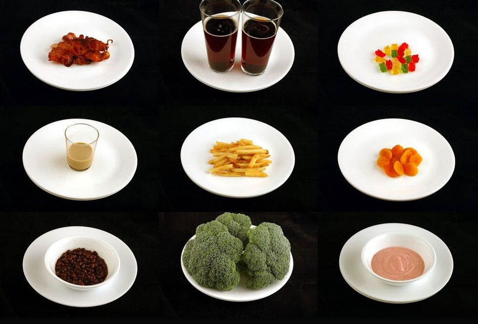 Going row by row, starting at the top left: Bacon (34 grams); Coca Cola (496 milliliters); Gummy Bears (51 grams); Bailey’s Irish Cream (60 milliliters); French Fries (73 grams); Dried Apricots (83 grams); Canned Black Beans (186 grams); Broccoli (588 grams); and Lowfat Strawberry Yogurt (196 grams).