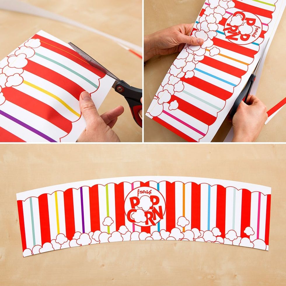 We recommend that you purchase the same paint bucket we used so that the printable will fit. The dimensions are important here, since the print might not fit a different container as well. The handle can easily be popped off of this bucket if you want a more classic popcorn tub look, but it’s not necessary to remove it.