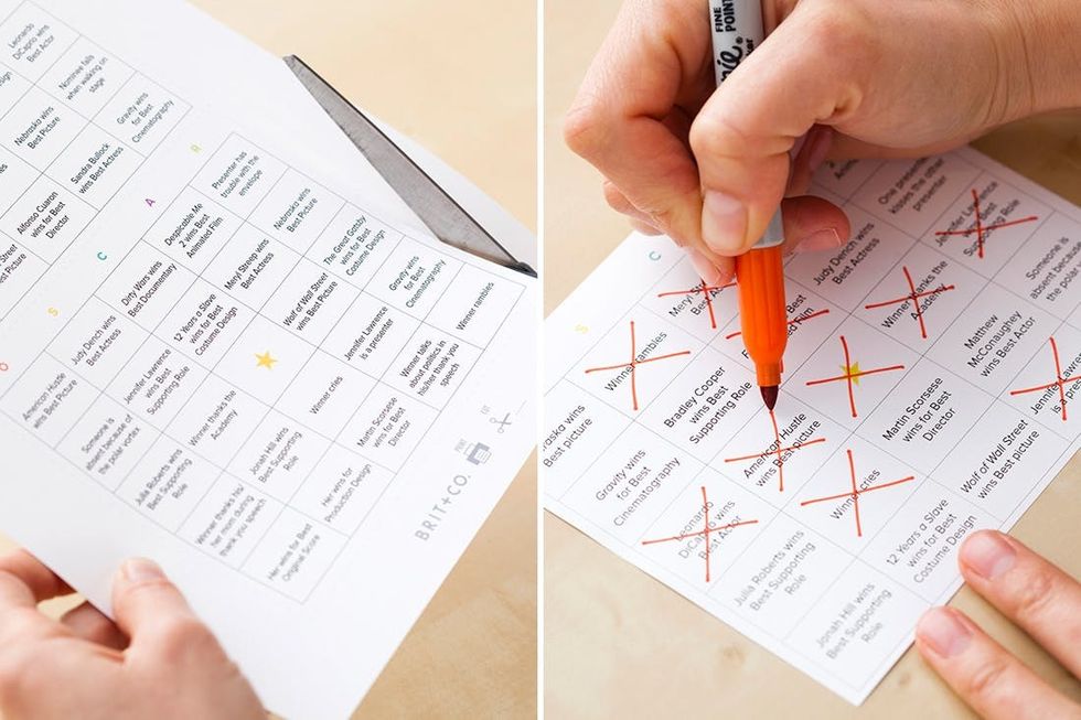 It’s Bingo time! The rules of this game are just like regular Bingo, except that you’ll be following along with the Oscars to cross off your squares rather than waiting on someone to call out “B9!” Along with predictions written in each square—like celeb nominees and movie titles—we’ve got other fun possibilities like “winner cries” or “presenter has a wardrobe malfunction.” You know, all the usual Oscars drama. :) Our printable has six unique cards, so if you’ve got more than six people in attendance, they should team up. Cool?