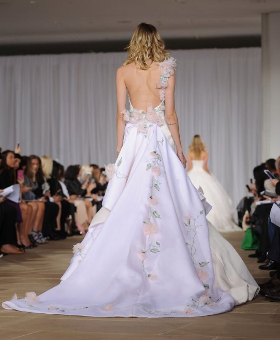 If you’re the type that wouldn’t be caught dead in a big white dress, the bridal suit was made for you. Pamella Roland, Houghton, Theia, Angel Sanchez and Carolina Herrera bring us perfectly tailored tuxedos, chiffon-topped jumpsuits and wide-leg trousers with sheer cropped tops that have undeniable cool-girl edge that’s still just as elegant as a sophisticated mermaid or ball gown. (Photo via Randy Brooke/Getty)