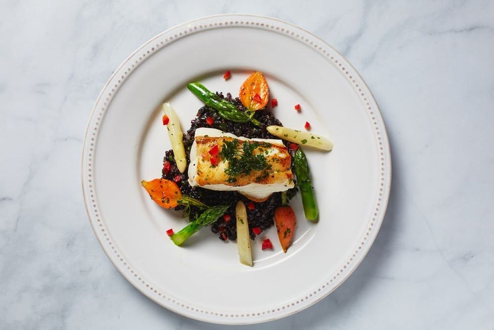 The main dish is a choice of Chilean sea bass, placed over forbidden black rice, white and green asparagus, globe carrots, crispy herb leaves, and a sweet pepper concasse.