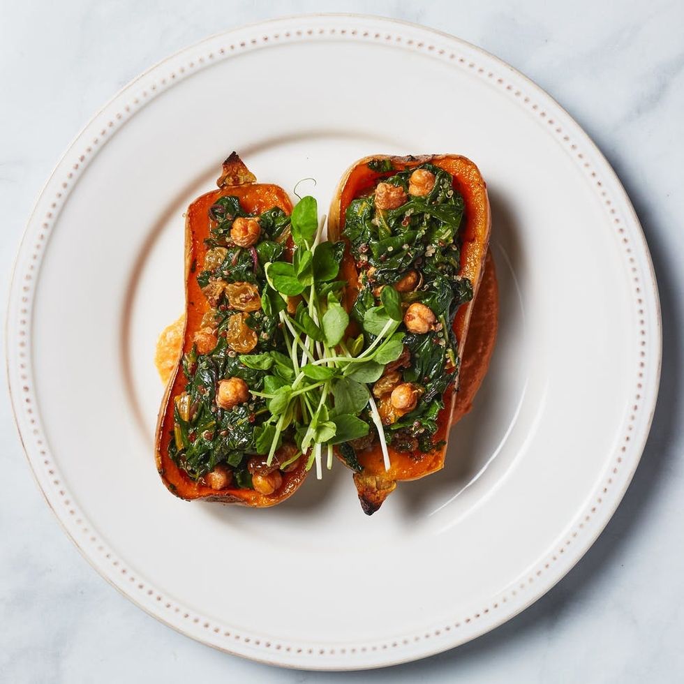 Or there’s the vegan option: a local organic stuffed honeynut squash served with piquillo pepper hummus, braised rainbow chard, crispy chickpeas, quinoa, golden raisins, and sunflower sprouts.