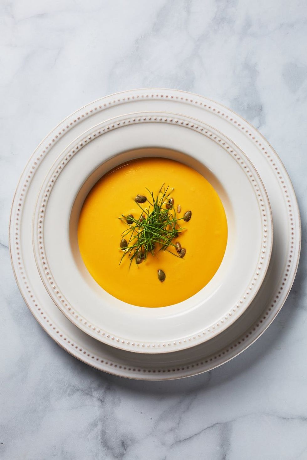 First, guests will nosh on a sweet potato vichyssoise appetizer, featuring golden leeks, organic red garnet yams, and roasted pepitas. It’s topped with wild micro chives specially planted by Morgan for the event.