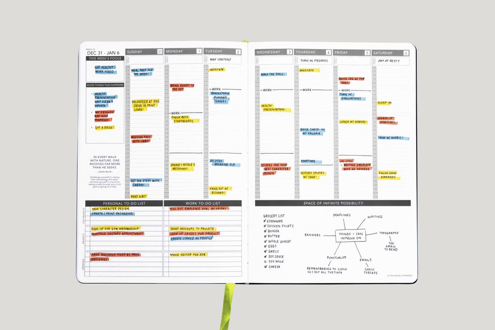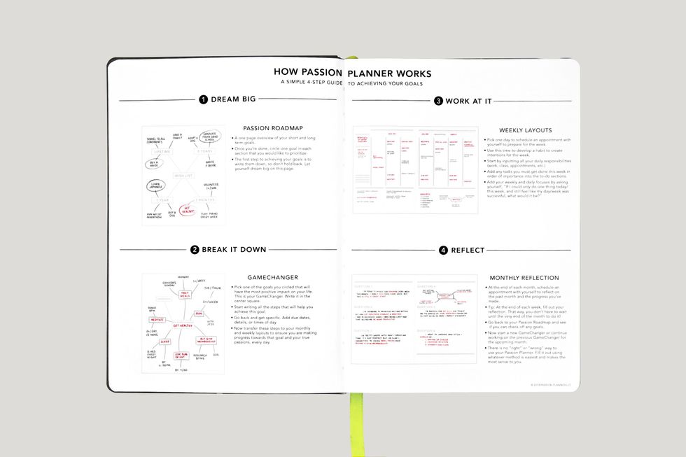 The Passion Planner ($30): Another great choice for one looking to do more than just keep a record of their day is the Passion Planner. Available in two sizes, the Passion Planner is a great choice for staying on task is multiple areas of your life. The weekly pages include to-do lists for your personal and work life, and a schedule to break down large goals into a detailed timeline. Areas designated for gratitude and reflection help you celebrate what you've accomplished and make adjustments for future goals. And, if you purchase a Passion Planner, the company will donate one to someone else. (Swipe for a peek inside)