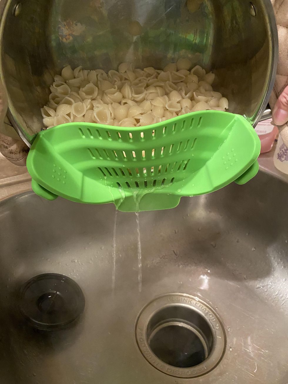 This snap-on strainer is simply brilliant. I don't need to worry about burning myself when pouring into a strainer over the sink anymore. I just clip this on and pour the pot out. It's just a perfect design.