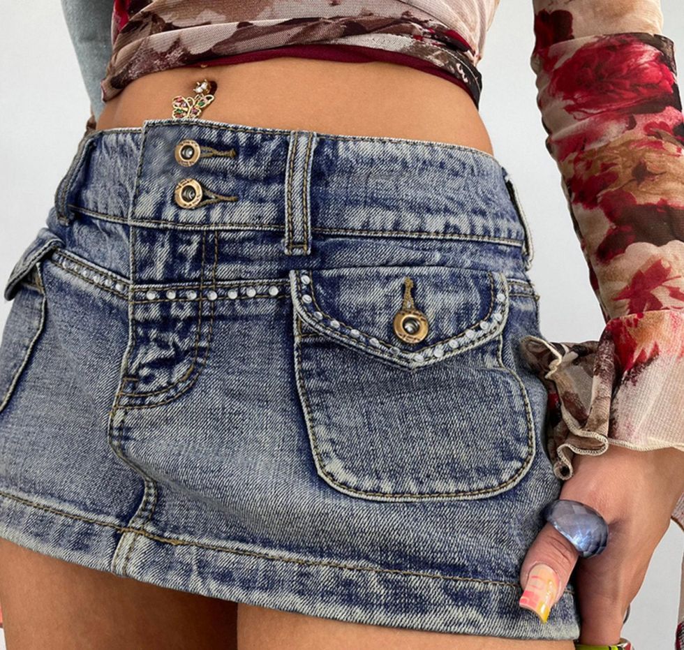 There are mini skirts, and then there are ultra mini skirts. Ultra mini is one of this season's hottest trends. If you want to feel like you belong in a music video from 2003, you're going to love this Y2k Diamond Stud Low Waisted Denim Mini Skirt. Pair with a DIY baby tank, some chunky sandals, and a Playboy belly button ring to really go full Y2K.