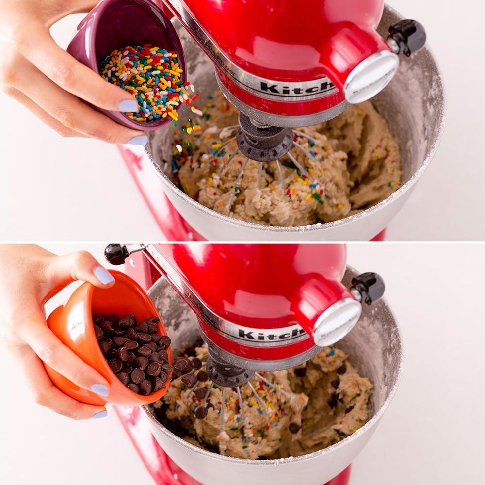 3. Add in the dry ingredients and mix until combined. Mix in the sprinkles and the chocolate chips.